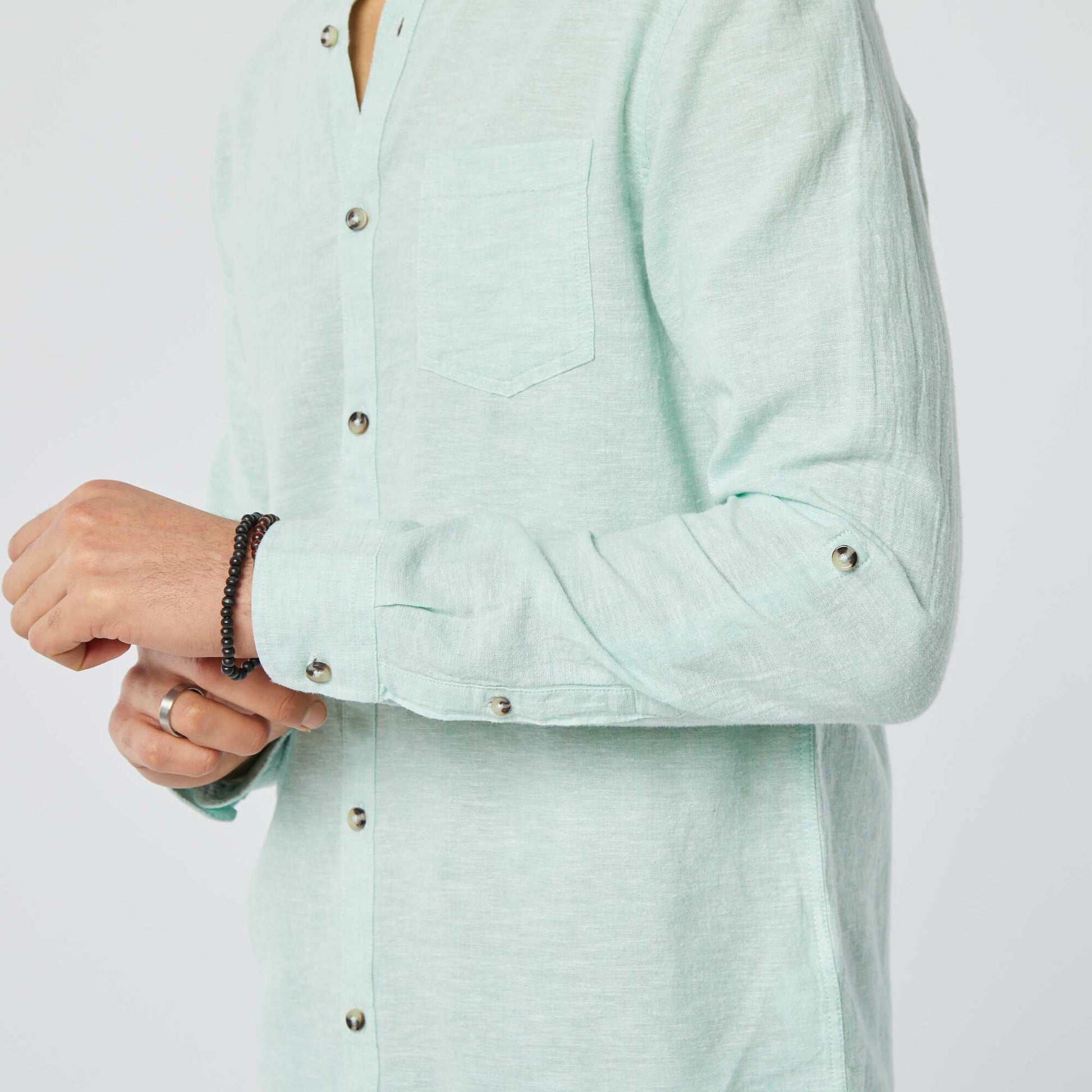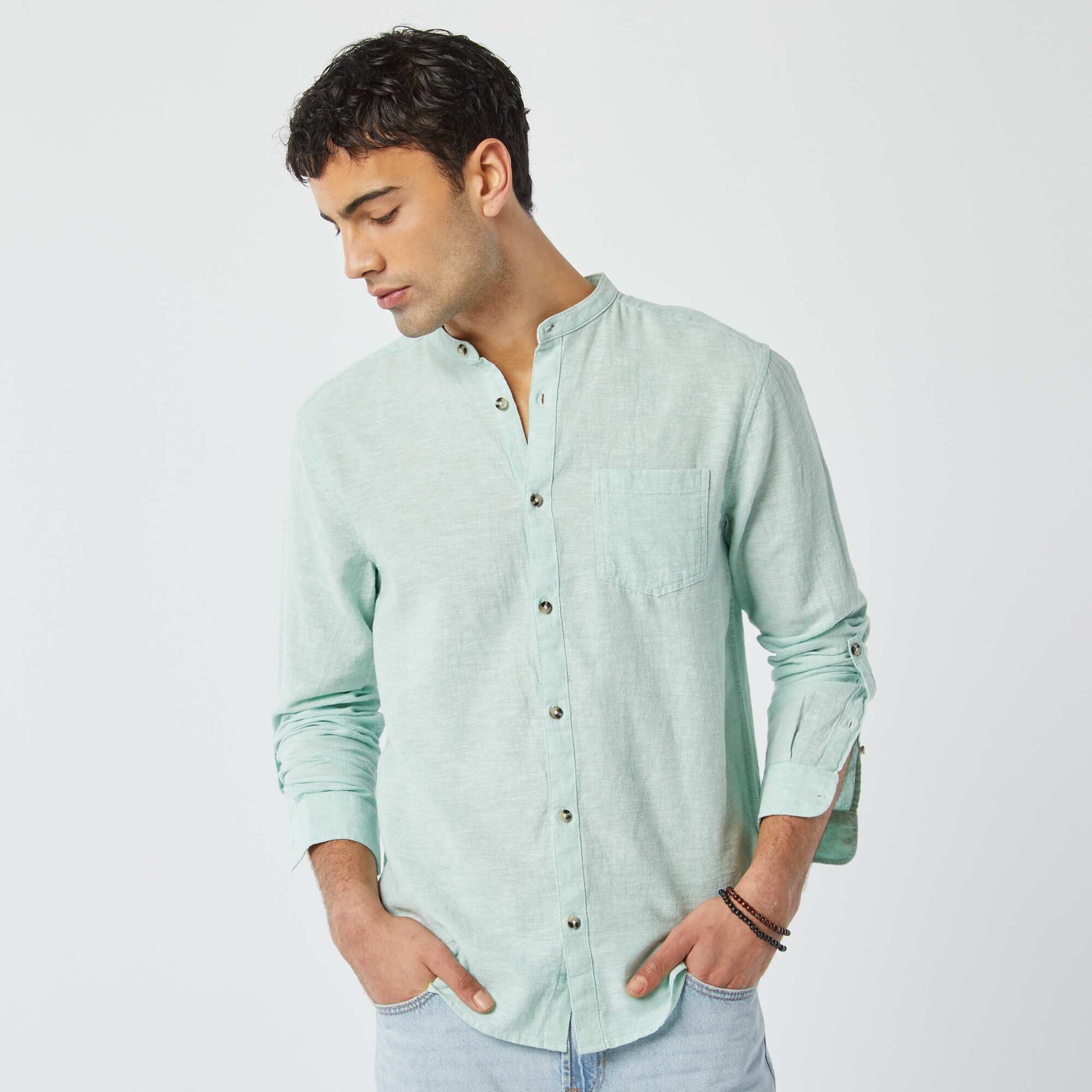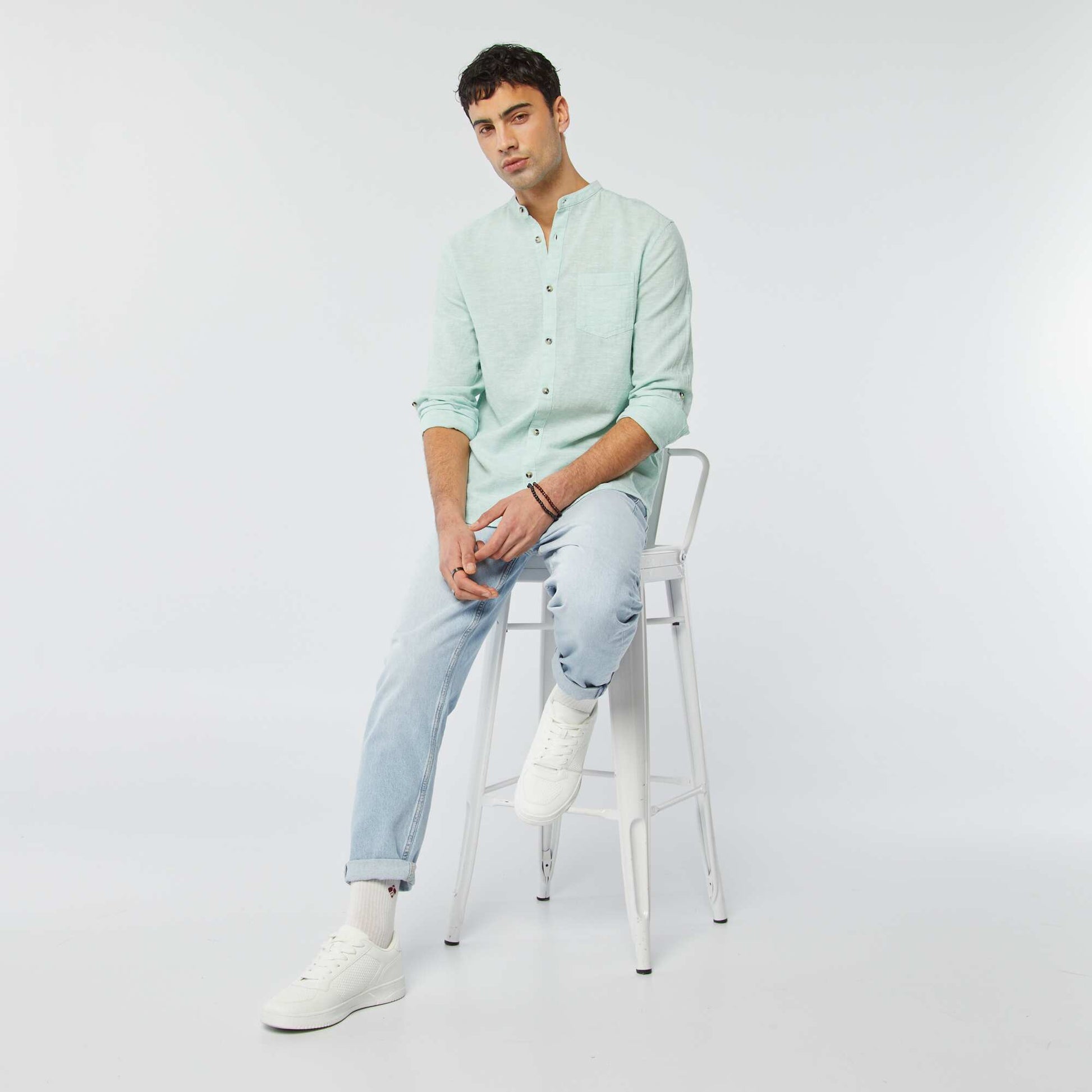 Cette chemise, avec sa matière lin et son col mao, apporte un côté très chic ! - Chemise unie - En lin et coton - Col mao - Manches longues retroussables - Ouverture boutonnée - 1 poche sur poitrine - Plis d'aisance au dos - Longueur dos : 75 cm environ - Notre mannequin porte une taille M et mesure 1m89
