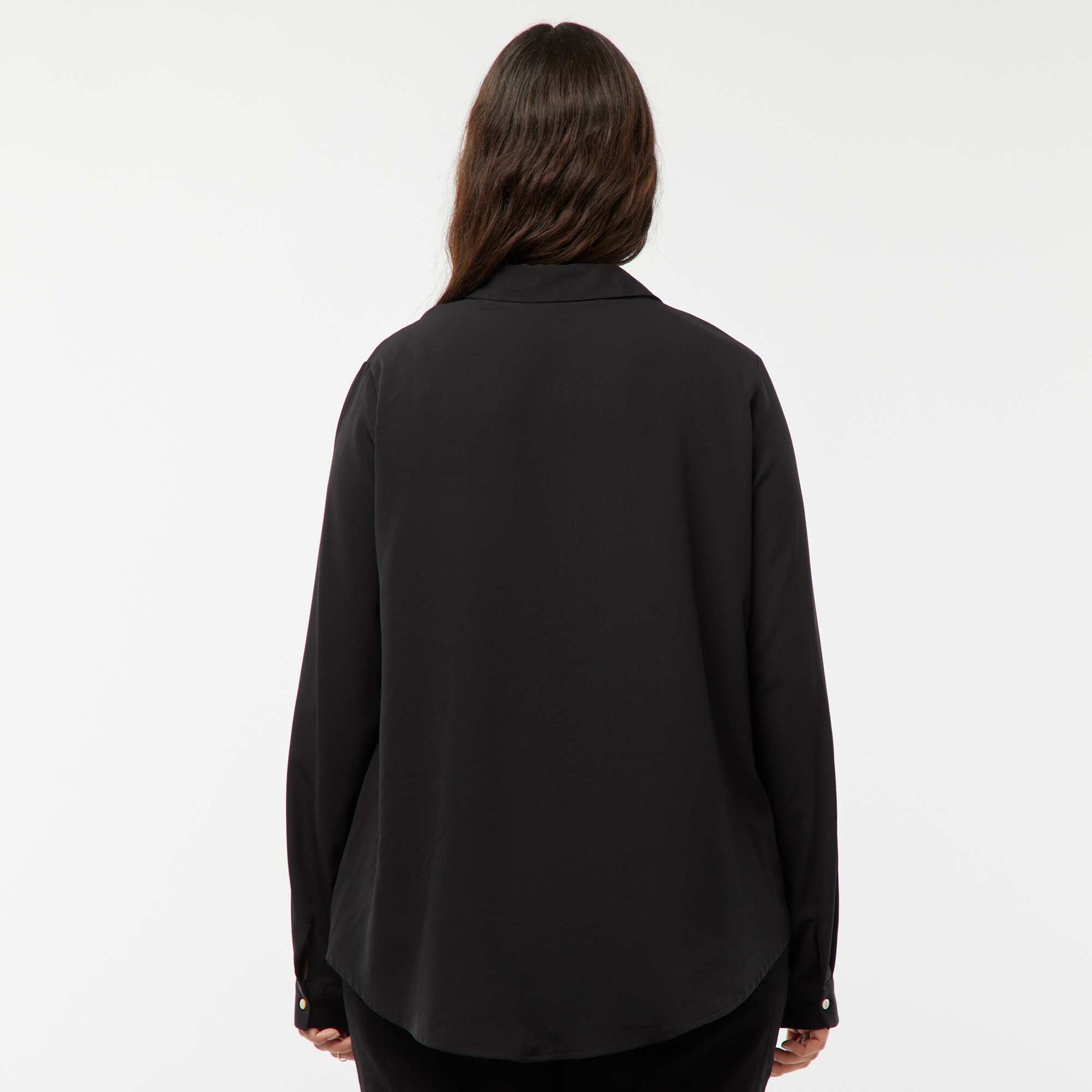 Découvrez notre chemisier fluide en maille crêpe, une pièce légère et élégante qui offre un confort absolu tout en étant facile à porter. - Chemisier uni - Maille fluide - En maille crêpe - Manches longues - Poignets boutonnés - Ouverture boutonnée devant - Encolure en V avec col chemise - Base arrondie - Longueur dos : 75 cm environ - Notre mannequin porte une taille XL et mesure 1m75