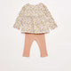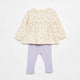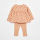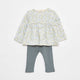 Découvrez ce joli ensemble aux détails très mignons. - Ensemble - 2 pièces - T-shirt en jersey - Base évasée - Manches longues - Col rond - Ouverture goutte d'eau au dos - Détails volantés - Imprimé all over - Legging assorti - En maille côtelée - Taille élastiquée - Couleur unie