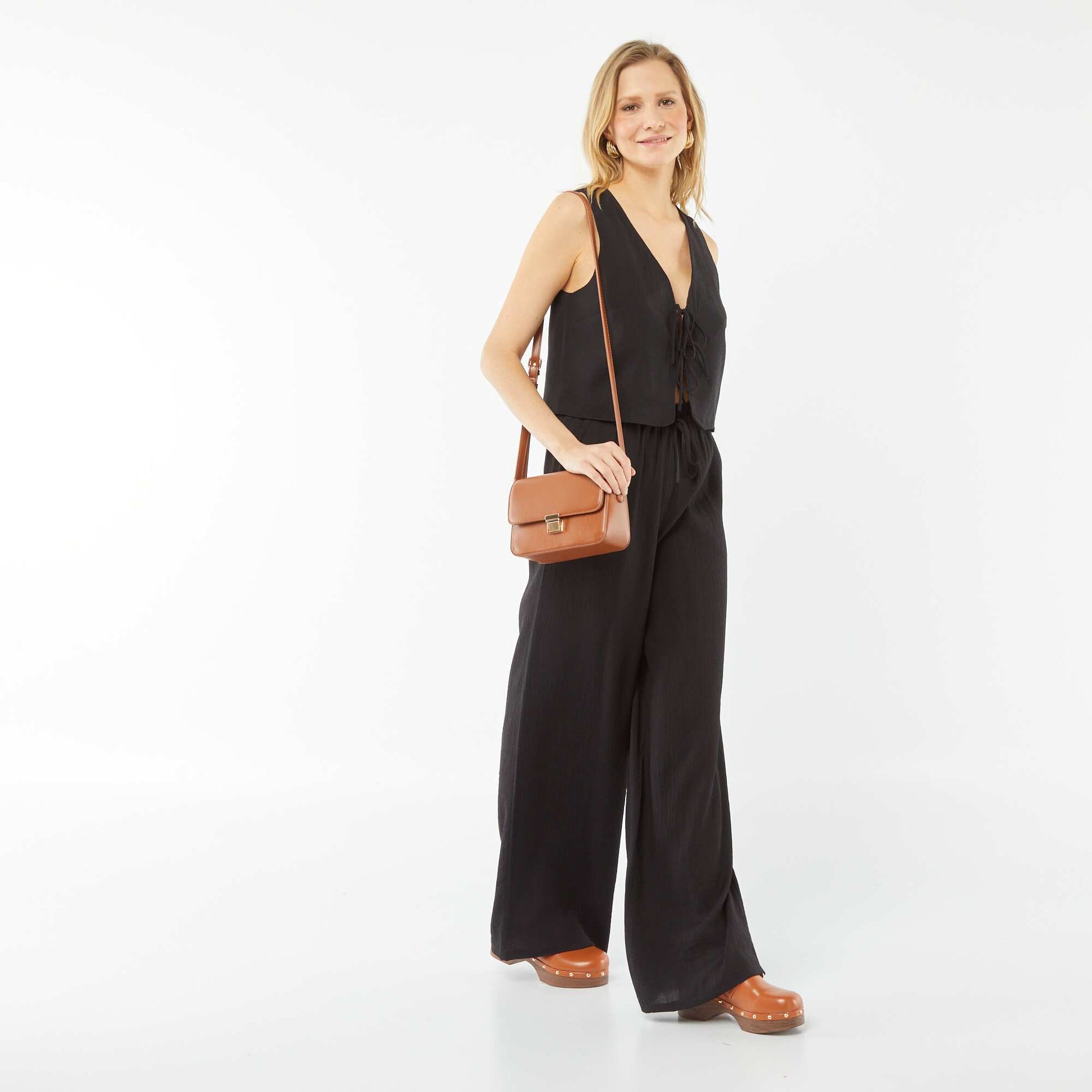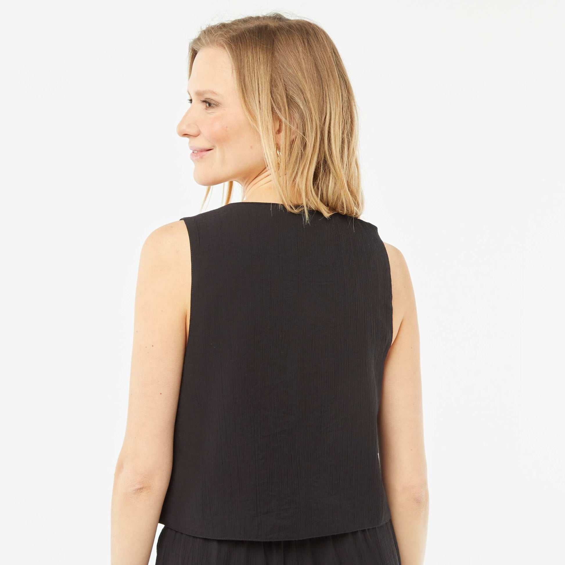Le gilet sans manches avec les nœuds qui lui apporte cette touche unique ! - Gilet sans manches - Maille crêpée - Col en V - Liens à nouer devant - Longueur dos : 43 cm environ - Notre mannequin porte une taille S et mesure 1m75