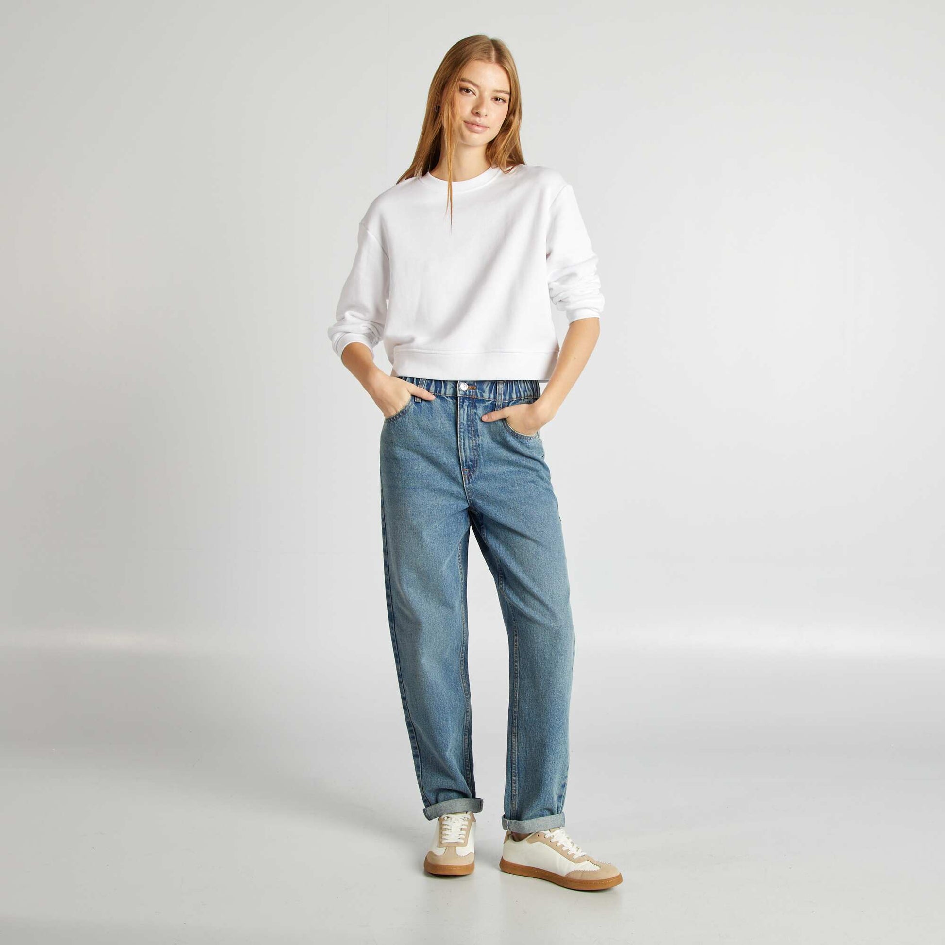 Ce pantalon 100% coton s’adapte à tous les styles et se porte aussi bien avec un sweat qu'avec un chemisier. - Jean paperbag en Denim - 100% coton - Taille élastiquée - Ouverture zippée + bouton devant - Passants pour ceinture - 2 poches devant + 1 poche ticket - 2 poches au dos Notre mannequin porte une taille 36 et mesure 1m72 Ce produit a été délavé avec un procédé plus économe en eau et en produits chimiques.