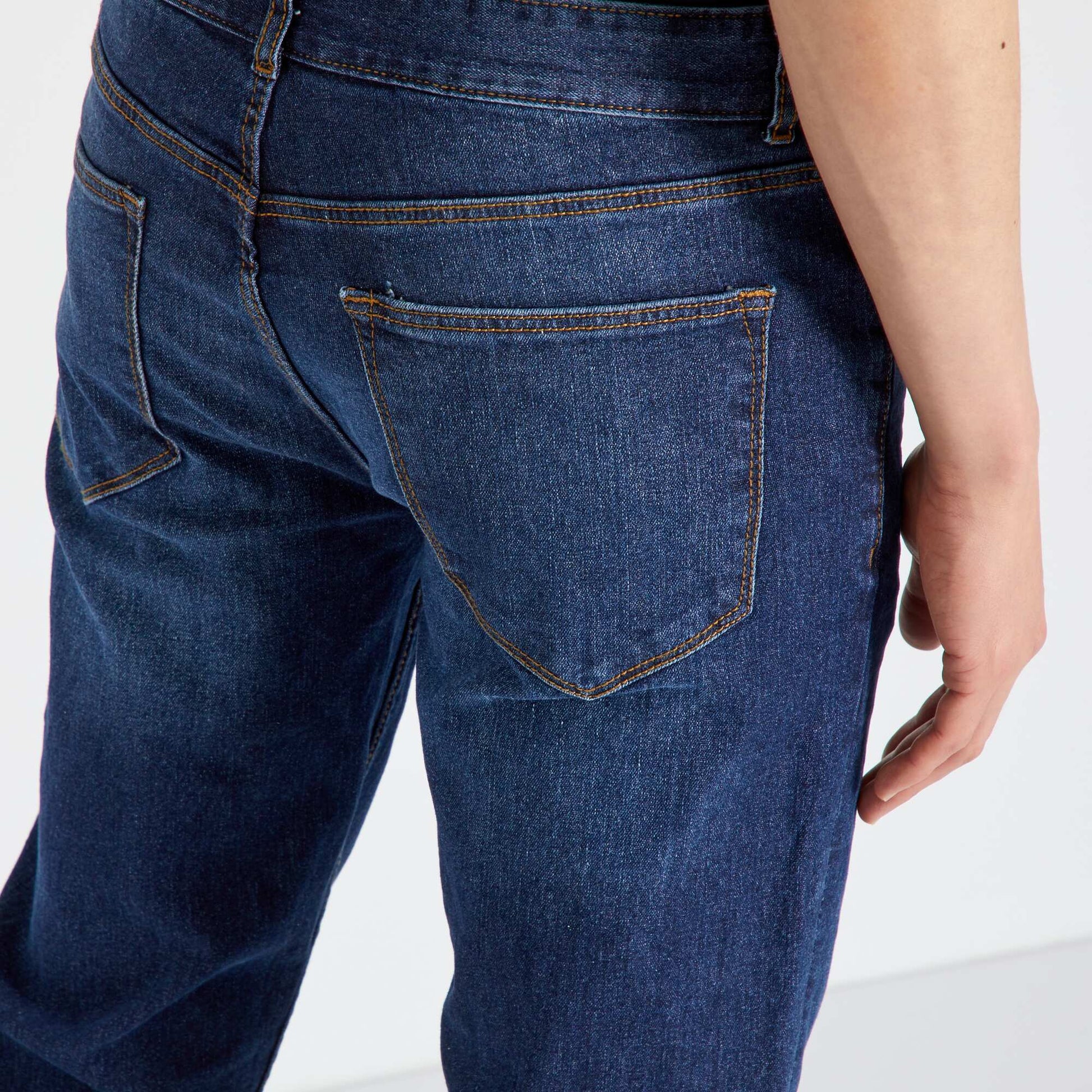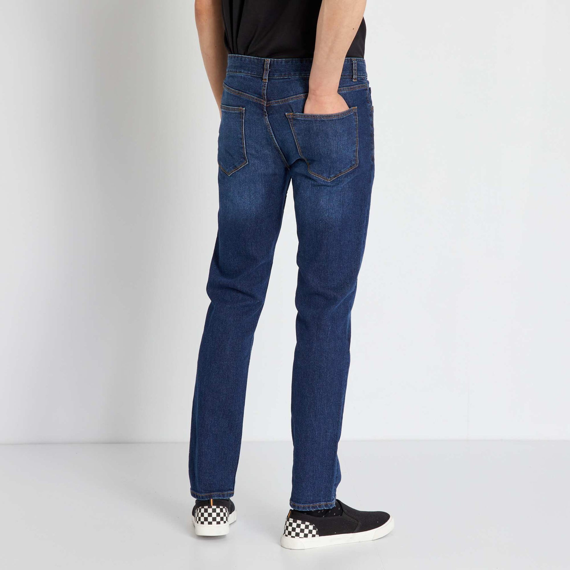 Un grand classique mais éco-responsable ! - Jean en coton stretch - Issu d'un éco procédé : Teinture ou délavage plus économe en eau et en produits chimiques - Slim fit / coupe ajustée - Passants pour ceinture - Ouverture boutonnée + patte zippée - 2 poches cavalières + 1 poche ticket devant - 2 poches plaquées derrière - Longueur entrejambe L34 : 83 cm (pour les personnes mesurant + d'1m80) - Largeur bas de jambe : 17 cm - Notre mannequin porte une taille 40 et mesure 1m87 Ce produit a été délavé avec un procédé plus économe en eau et en produits chimiques.
