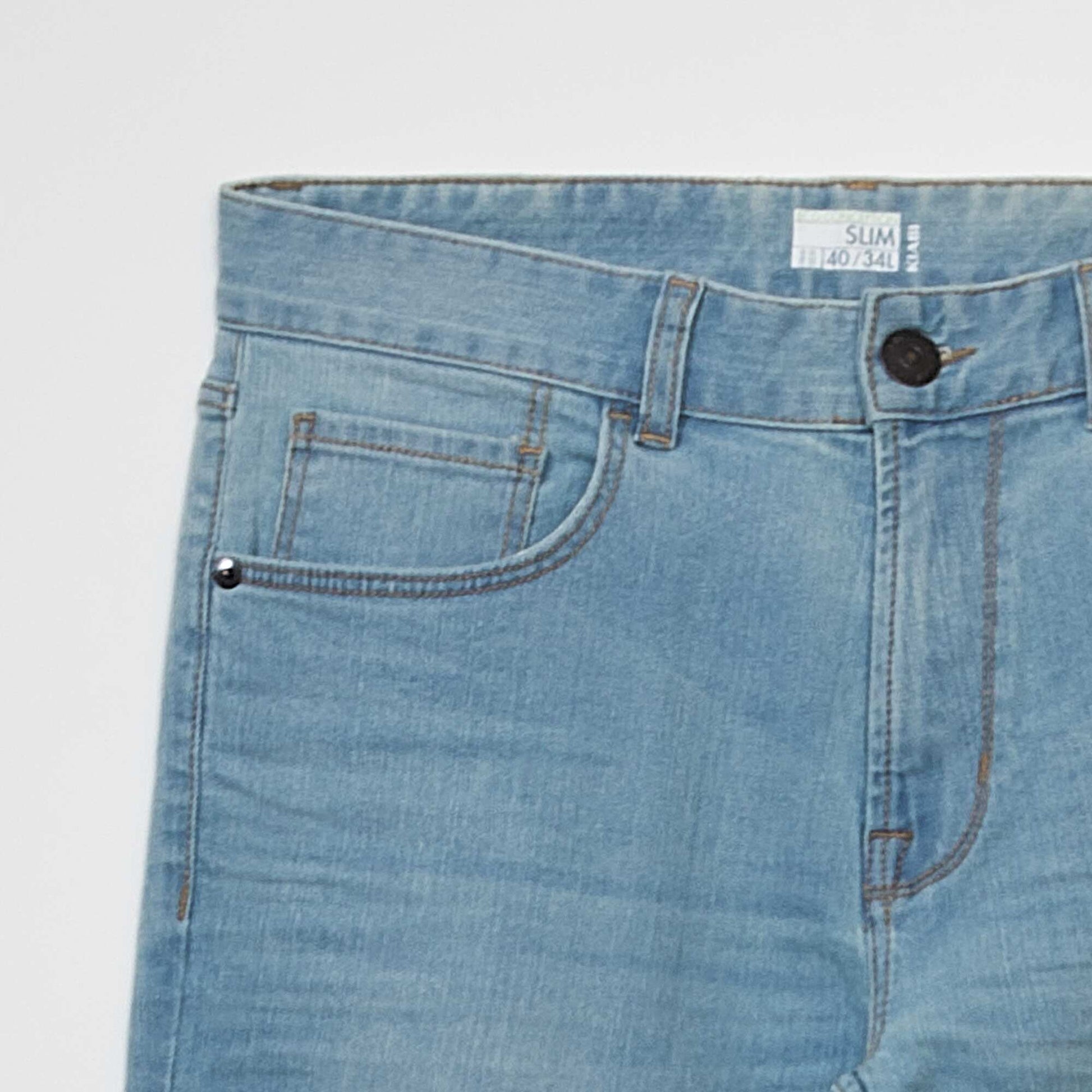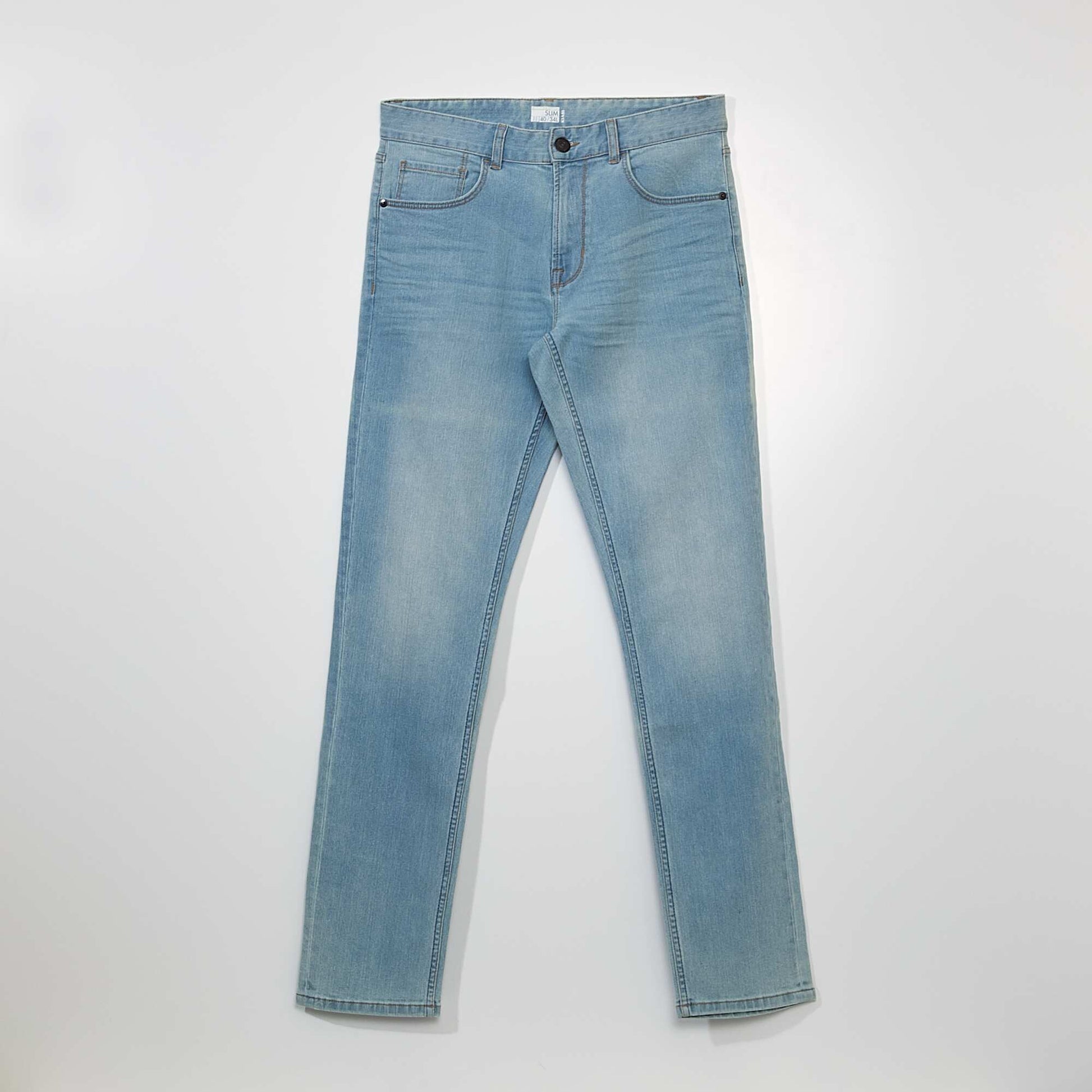 Un grand classique mais éco-responsable ! - Jean en coton stretch - Issu d'un éco procédé : Teinture ou délavage plus économe en eau et en produits chimiques - Slim fit / coupe ajustée - Passants pour ceinture - Ouverture boutonnée + patte zippée - 2 poches cavalières + 1 poche ticket devant - 2 poches plaquées derrière - Longueur entrejambe L34 : 83 cm (pour les personnes mesurant + d'1m80) - Largeur bas de jambe : 17 cm - Notre mannequin porte une taille 40 et mesure 1m87 Ce produit a été délavé avec un procédé plus économe en eau et en produits chimiques.