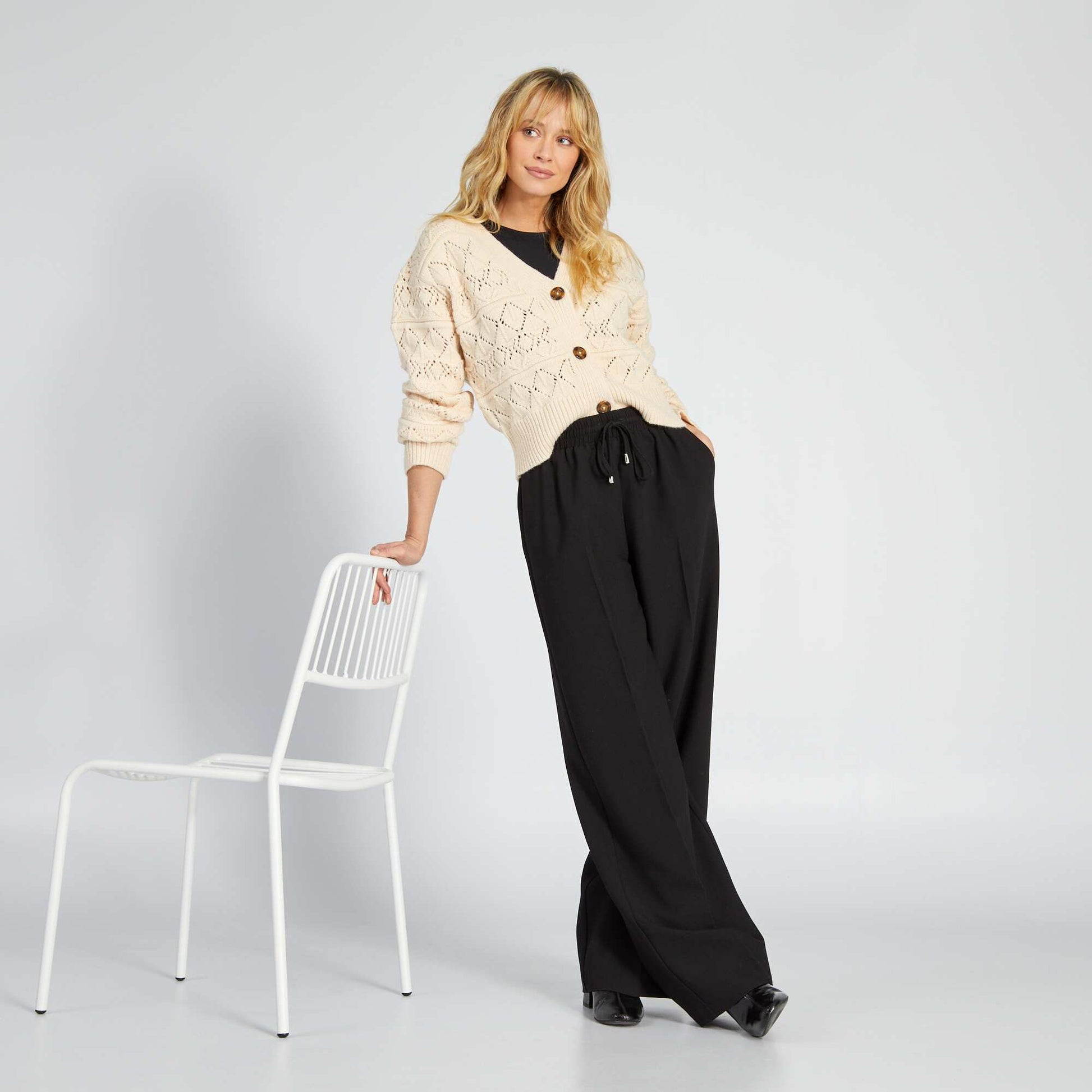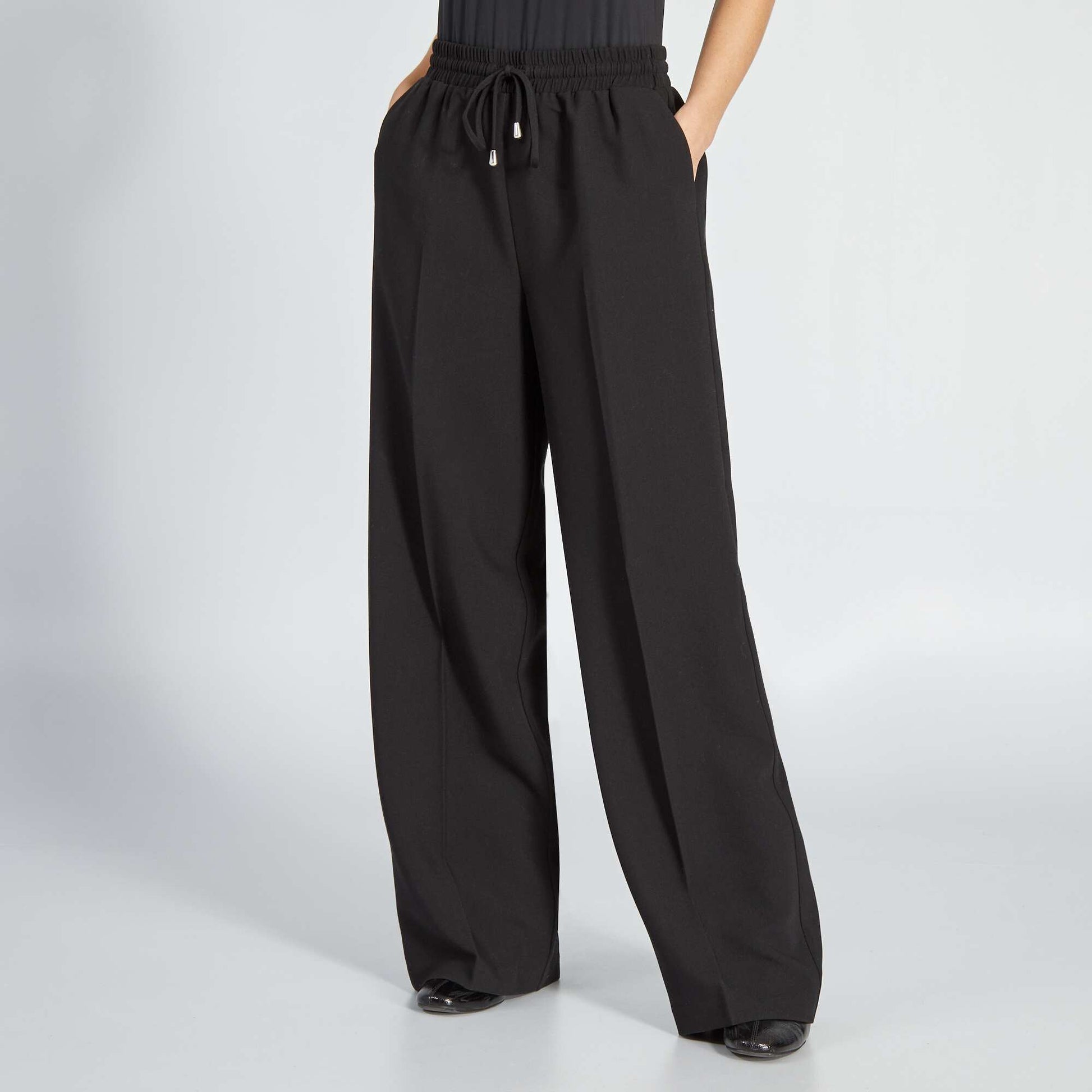 Je reconnais ton style streetwear chic travers ce pantalon ! - Pantalon large - Coupe droite - Taille lastiqu e - 2 poches plaqu es - Liens nouer avec d tails argent - Longueur entre jambe : 78 cm - Largeur bas de jambe : 25 cm Notre mannequin porte une taille S et mesure 1m70
