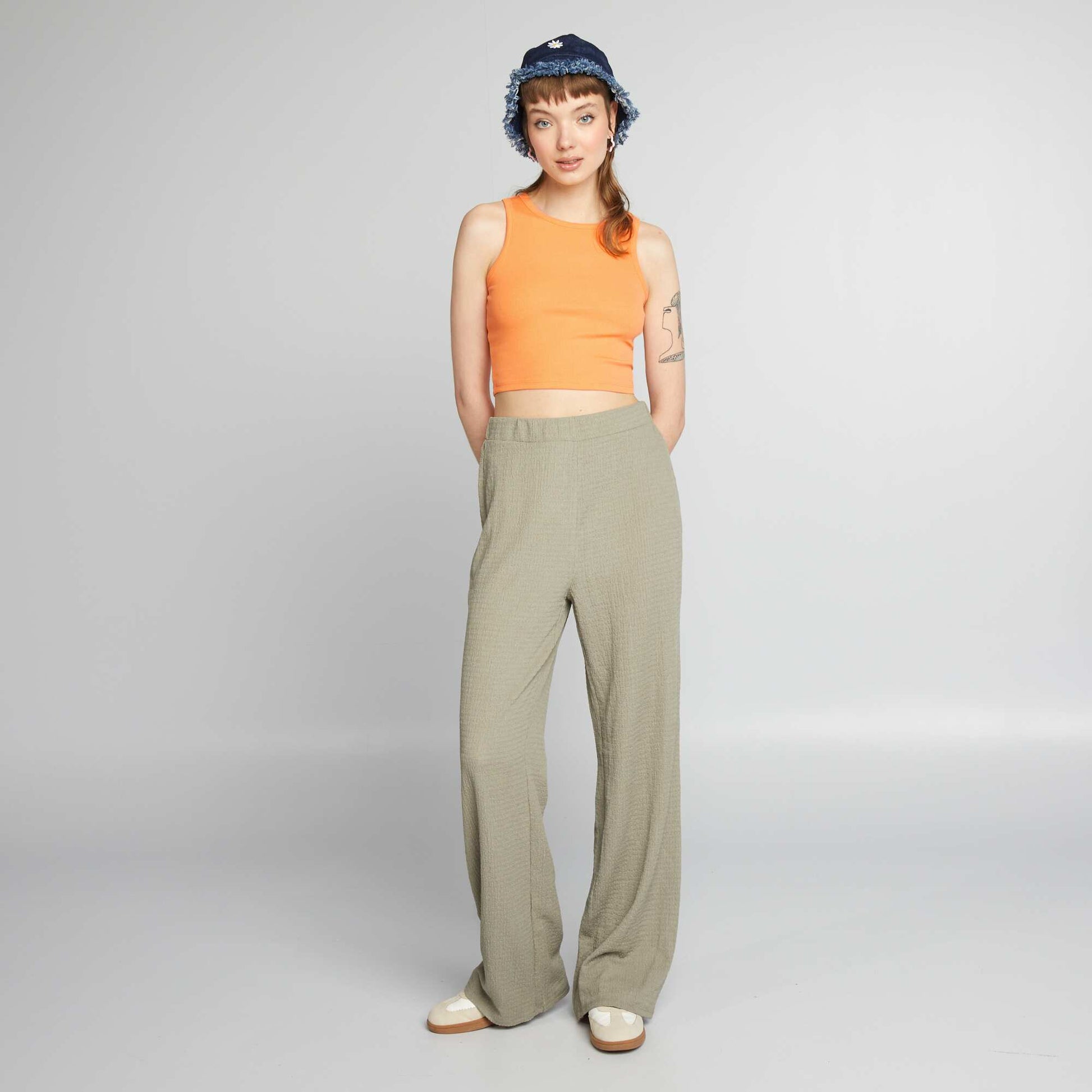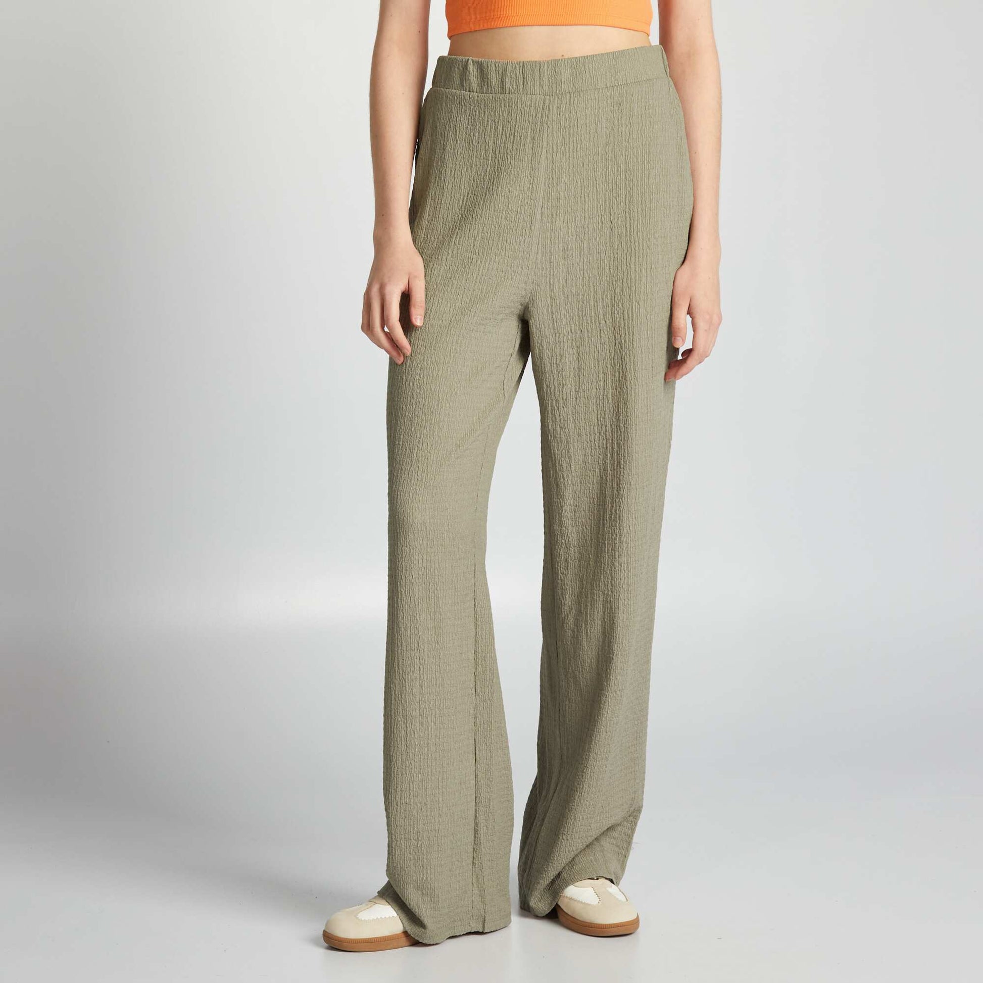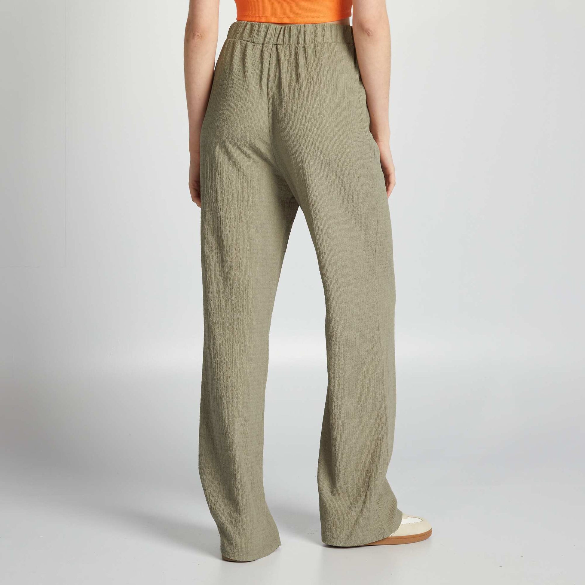 Un pantalon large en mati re gaufr e ! - Pantalon large - Mati re gaufr e - Taille lastiqu e - Longueur entrejambes : 82 cm environ - Longueur bas de jambes : 27 cm environ - Notre mannequin porte une taille S et mesure 1m76