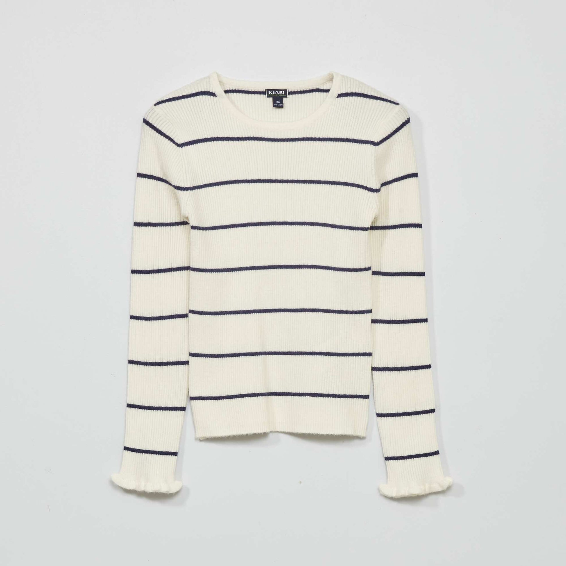 Pour un look moderne optez pour ce pull en maille c tel e ! - Pull en maille c tel e - Col rond - Manches longues - Volant s en bas de manches - Imprim 'rayures'