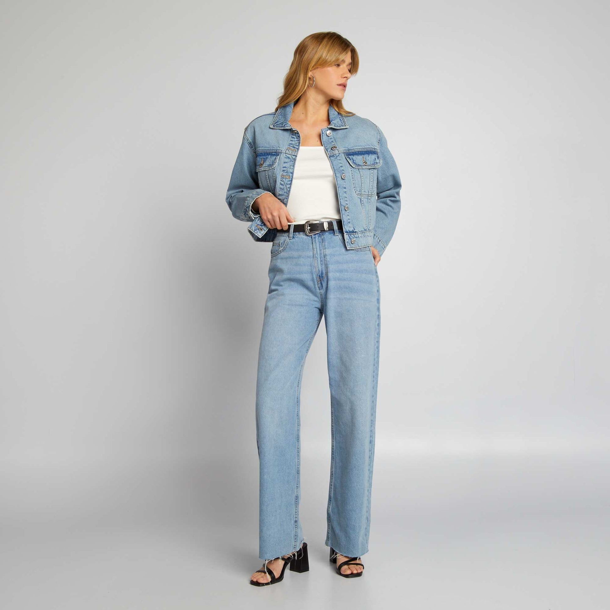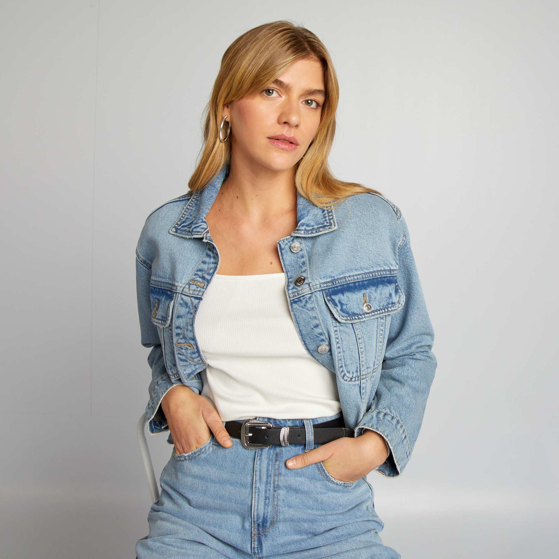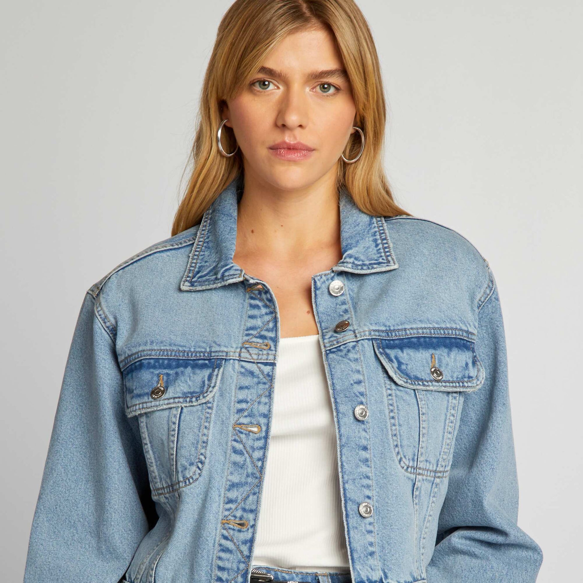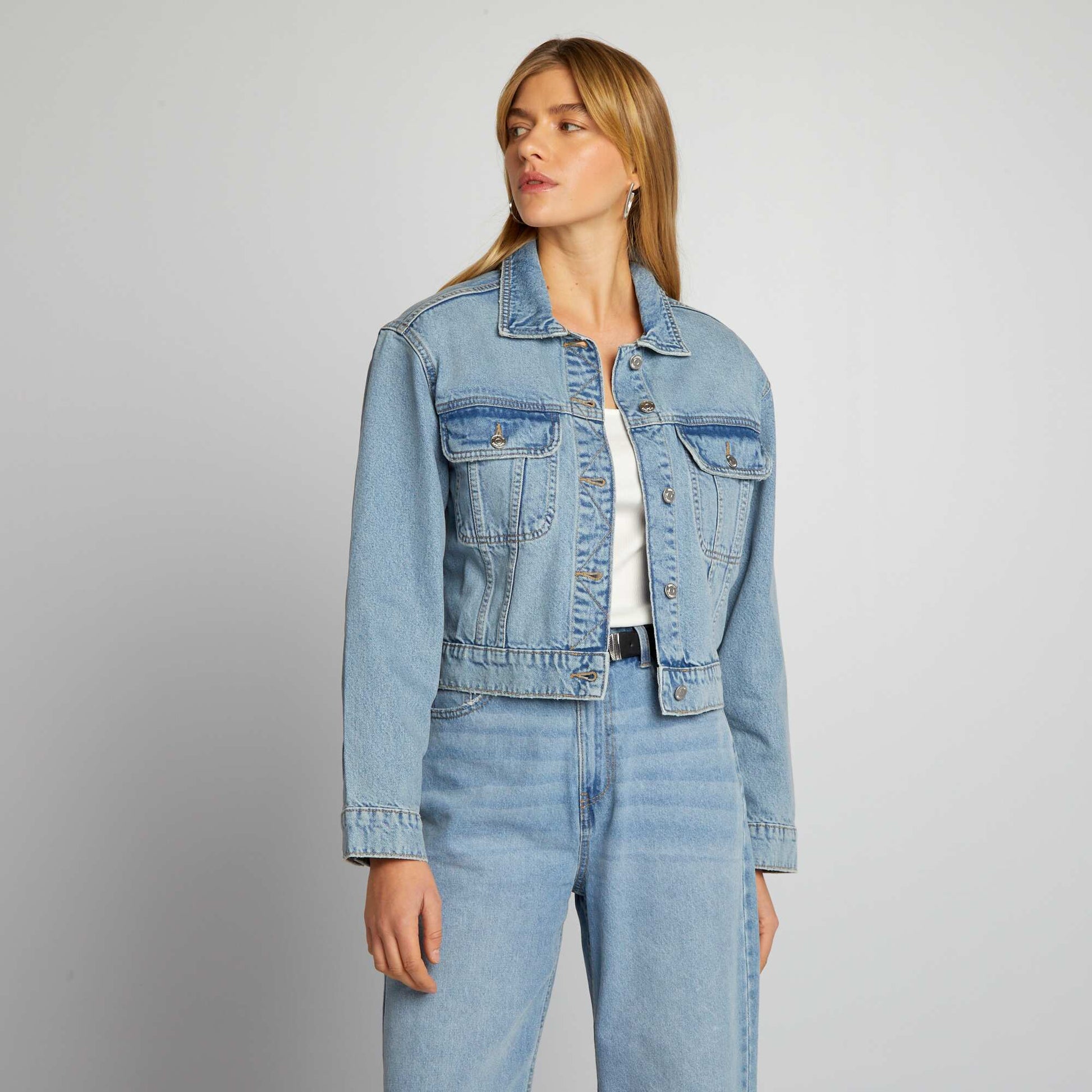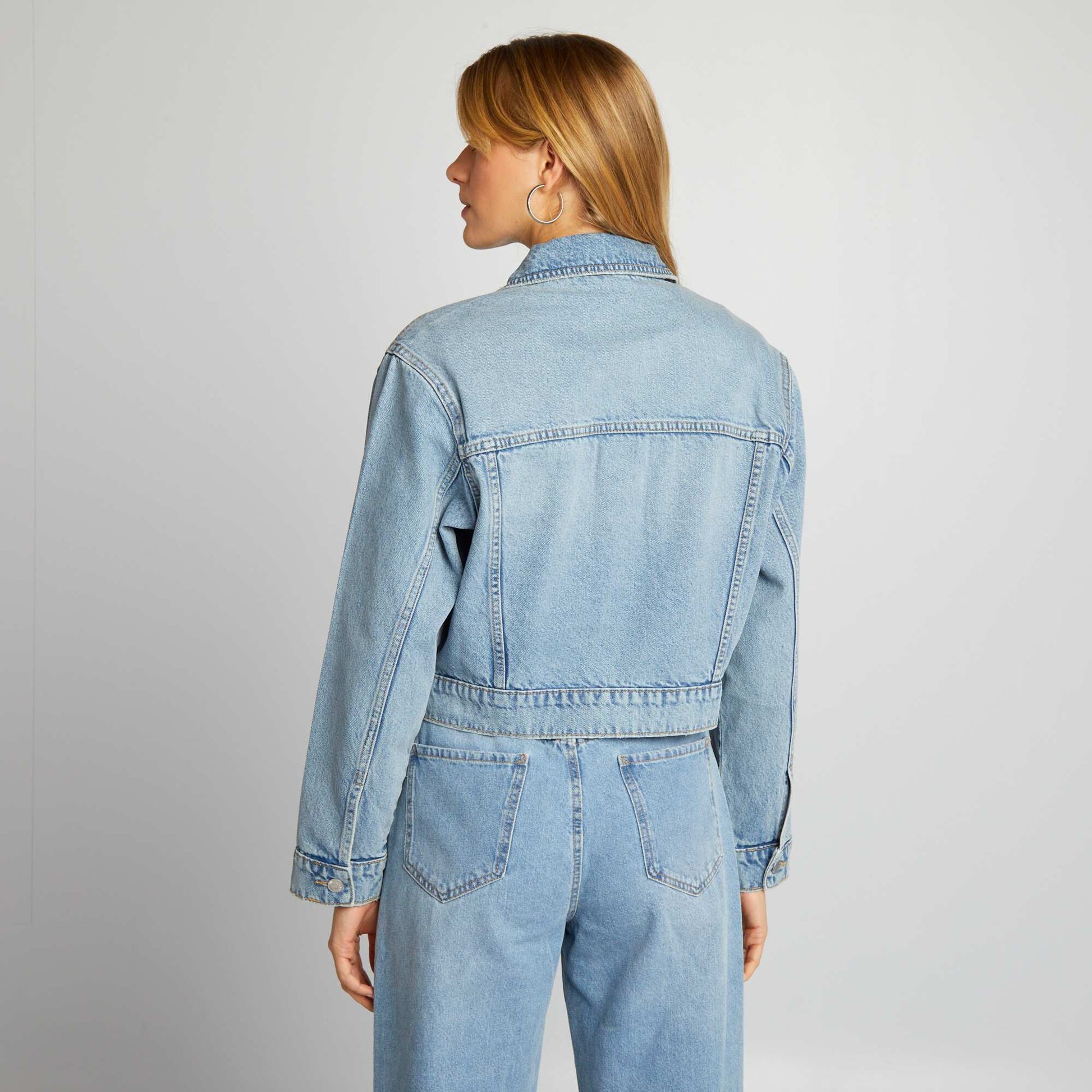 Une veste en denim pour agr menter votre look ! - Veste en denim - Col italien - Coupe courte - Ouverture devant par boutons m tal - Manches longues avec poignets boutonn s - 2 poches rabats la poitrine - Longueur dos : 50 cm environ - Notre mannequin porte une taille M et mesure 1m76